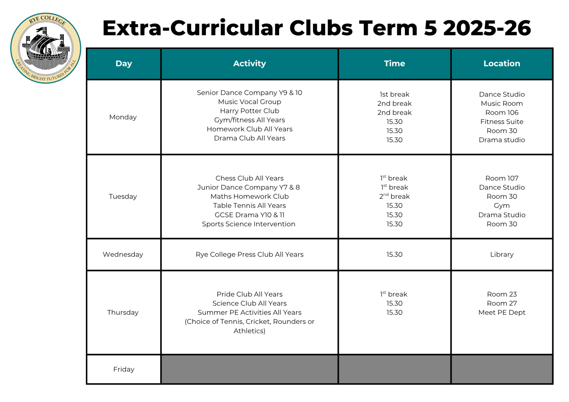 Extra Curricular Clubs Timetable Term 4 2025/26
