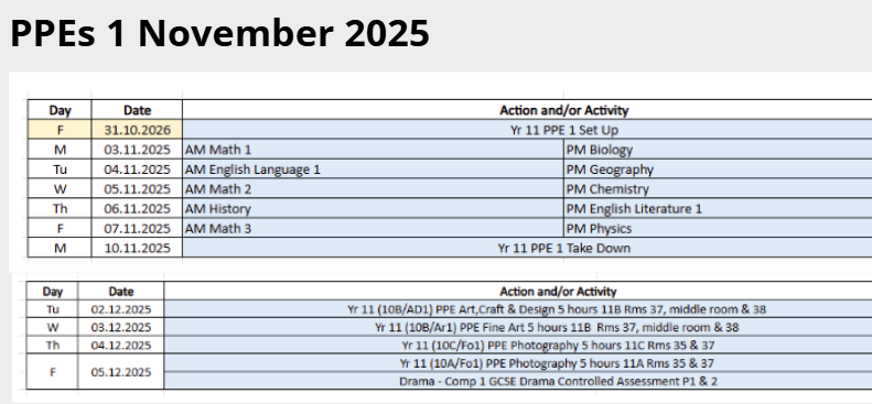 Pre-Public Examinations Series 1 | Monday, 3rd November - Friday, 7th November 2025 |